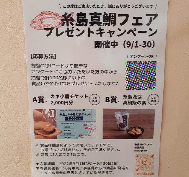 アンケートに答えると牡蠣小屋チケットか鯛めしの素があたる!